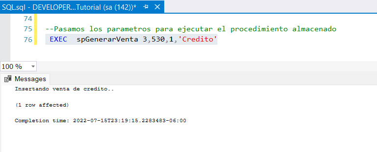CREATE PROCEDURE spGenerarVenta @AutoID as int, @Precio as decimal(6,2), @Cantidad as int, @FormaVenta as varchar(100) AS BEGIN IF @FormaVenta = 'Credito' BEGIN PRINT'Insertando venta de credito..' INSERT INTO AutosVentas(AutoID,Precio,Cantidad,FormaVenta) VALUES(@AutoID,@Precio,@Cantidad,@FormaVenta) END ELSE BEGIN IF @FormaVenta = 'Contado' PRINT'Insertando venta de contado..' INSERT INTO AutosVentas(AutoID,Precio,Cantidad,FormaVenta) VALUES(@AutoID,@Precio,@Cantidad,@FormaVenta) END END GO